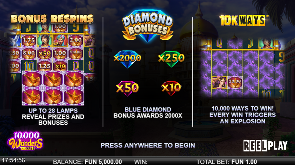 10000 원더즈 is a fantasy-themed video slot presented on Relax Gaming’s platform under the ReelPlay label. The official game page describes it as a video slot with up to 10,000 ways to win, cascading win chains, and bonus prizes inside a bonus respins feature.